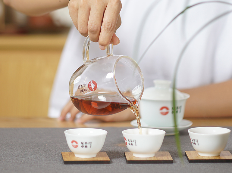 随着东卓品牌的制茶理念与茶品特性分享完毕,第一道原山本真普洱——汤色红浓艳丽,口感香甜顺滑的【百岁·生态乔木熟饼】正式出汤!